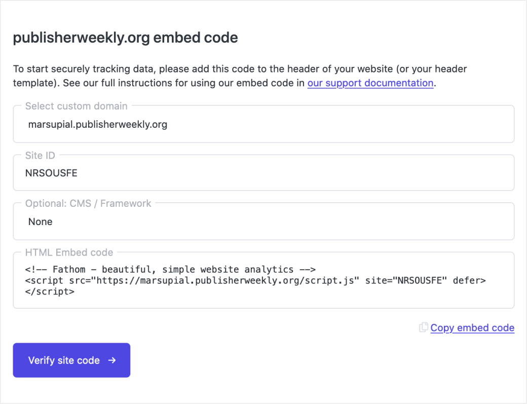When you create a new site in your Fathom Analytics account, you’ll be given HTML embed code, which you can copy to your clipboard: