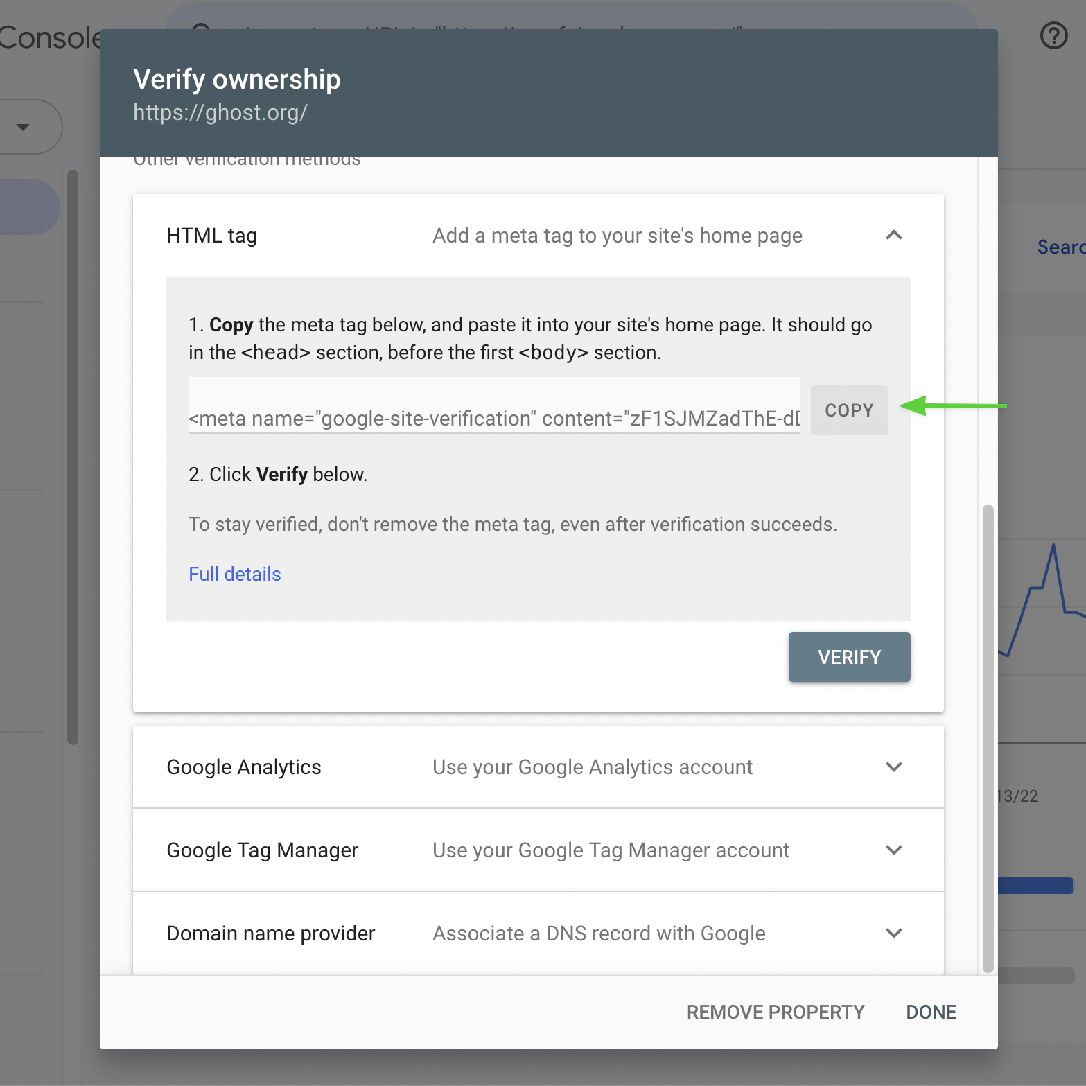 That’s it! Head back to the Search Console dashboard and click Verify to ensure you’ve successfully added the HTML tag. Now you can start reviewing performance data for your Ghost publication.