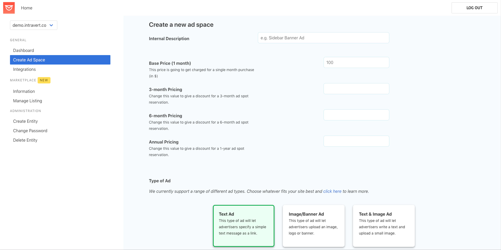 Create a unique ad space for your Ghost site, giving it a description and pricing model, and decide whether you’d like to place a text, image or text and image ad space: