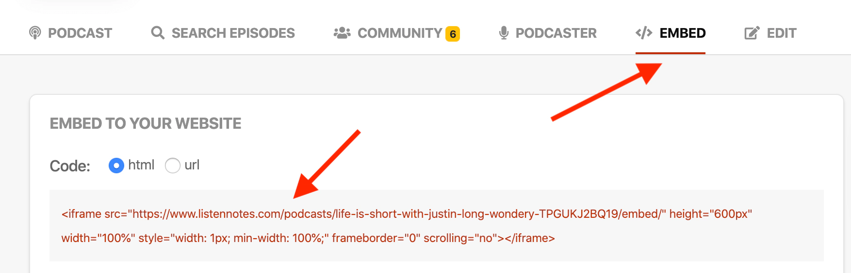 For further customisation of your embedded content, you can also use the embed code from Listen Notes.