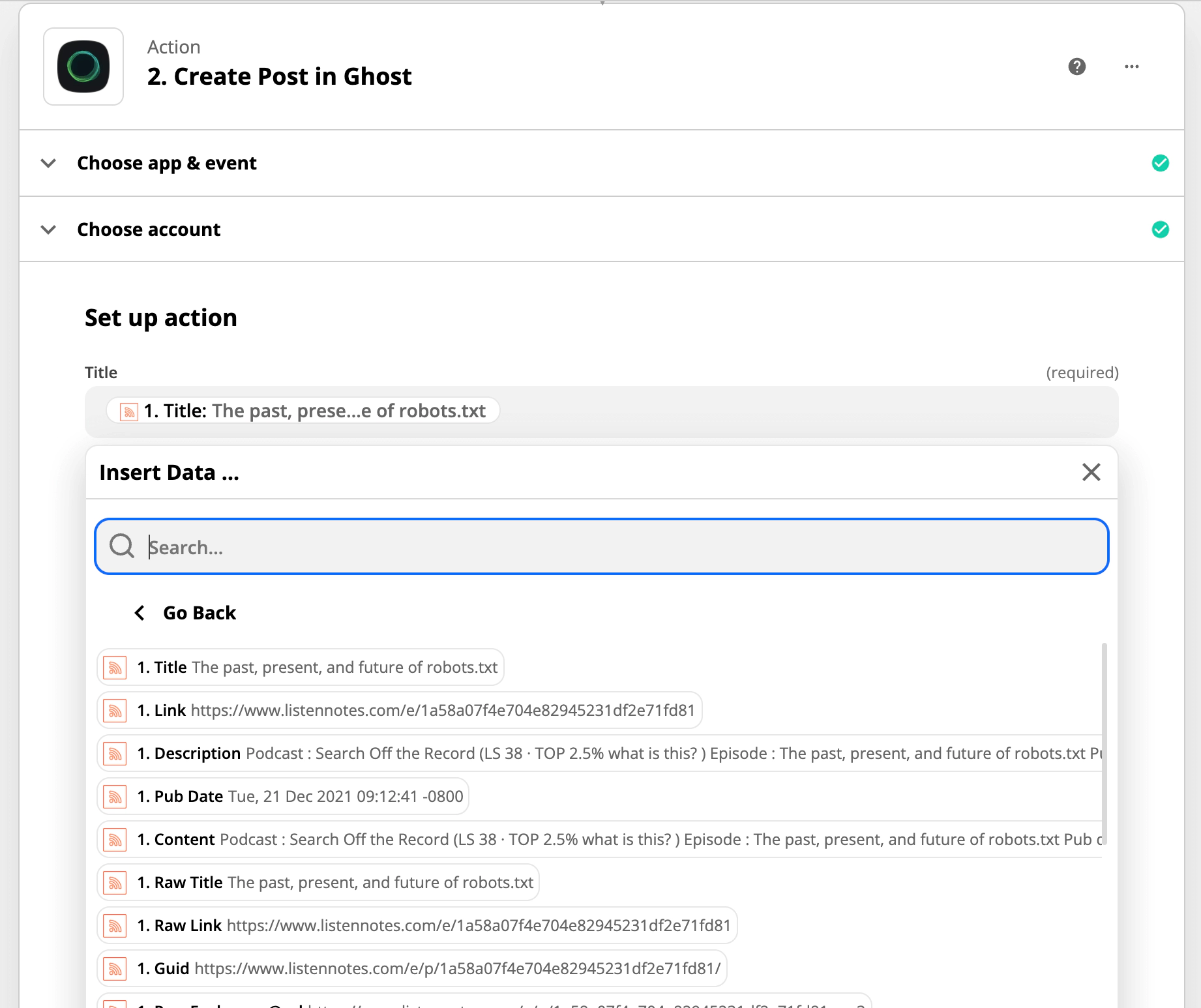 It’s also possible to automatically create a post in Ghost when a new episode is added to your Listen Later playlists, using Zapier. To do this, use the RSS by Zapier action step, using the RSS feed for your Listen Later playlist: